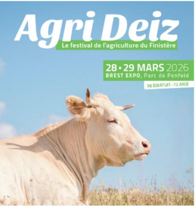 | Description | Agri Deiz... Le Festival de l’Agriculture et de l’élevage du Finistère AGRI DEIZ, le Festival de l’agriculture et de l’élevage du Finistère est organisé chaque année, alternativement sur Quimper et Morlaix. Pour la 2ème fois de son histoire le festival sera brestois. Programmée, les 27, 28 et 29 mars 2026, la 10e édition se déroulera à Brest expo, Parc de Penfeld. Cet événement promet, le temps d’un week-end, une plongée immersive dans l’univers agricole. Passionné d’agriculture ou d’élevage, ou simplement à la recherche d’une sortie divertissante en famille, le festival offrira une expérience enrichissante pour tous. Horaires : Le vendredi 27 mars – Journée dédiée aux scolaires : 9h00 à 13h00 Le samedi 28 mars : de 10h00 à 19h00 Le dimanche 29 mars : de 10h00 à 18h00. Tarifs : Entrée 5 € Gratuit : pour les moins de 12 ans. Parking : Gratuit. |
